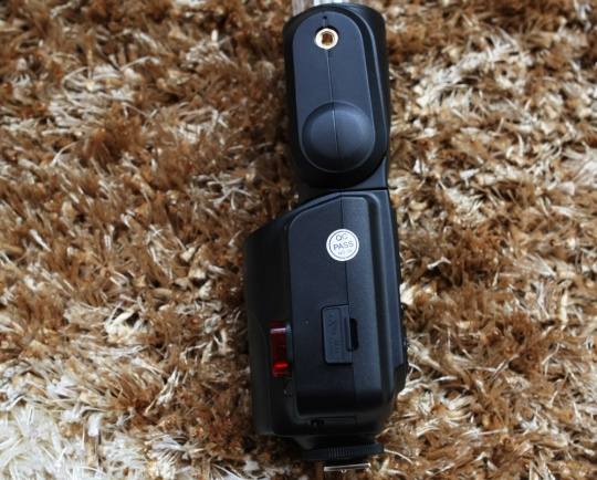 闪光灯右侧最上面有一个伞座安装孔,下面就是电源插口