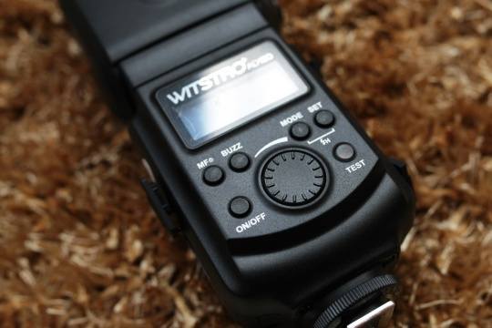 这款闪光灯的后背,采用了一块液晶屏作为数据的显示。同时还配备了很多的调节按钮。基本上涵盖了闪光灯功率调节、闪光模式选择、蜂鸣开关、试闪光等等。这些功能按钮也是按照专业室影灯来设计的。作为摄影师来说,应该会很快上手的。