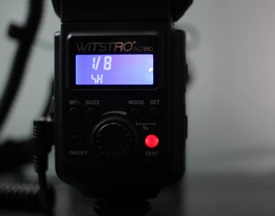 闪光灯功率调节:这是闪光灯最重要的调节参数了。直接控制闪灯不同的输出功率。调节功率很简单。只需要转动圆形波轮就可以了。AD180支持从OFF、1/128到1/1全功率输出的23级范围选择。当选择时,当然功率会以数字形式显示,还会以0.3和0.7档进行微调。