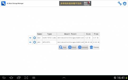 2. 开AL MASS STORAGE MANAGER,看看SD卡和移动硬盘是否装载上了,被分配到了哪个目录。