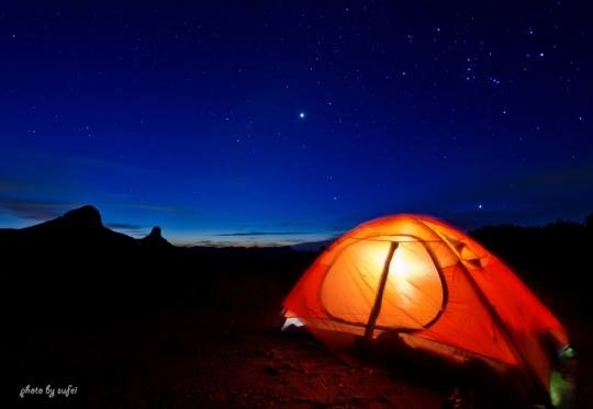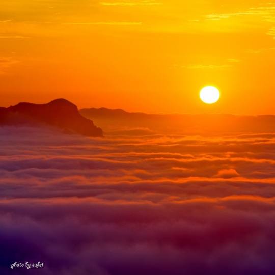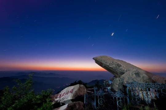 这张片子拍摄于日出前一个小时,天上依然满天星斗,天边已经泛起了红霞,背景天空也成了迷人的蓝紫色。黎明的下弦月照亮了地面,前景的拱北石则是被近处的灯光照亮的。几大因素共同构成了本片的光线环境