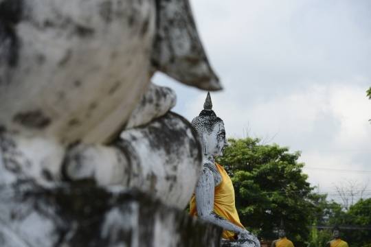 这座遗址相比普斯善佩寺,佛像更多更完整,成排的佛像披着黄色袈裟。大大小小的佛像蔚为壮观。拍摄中可以充分利用佛像的排列进行构图,可以拍到有趣的图片。另外泰国是个佛教国家,国人、僧侣都非常有爱心,遗址后院有很多流浪狗、流浪猫聚集,有人喂食它们。