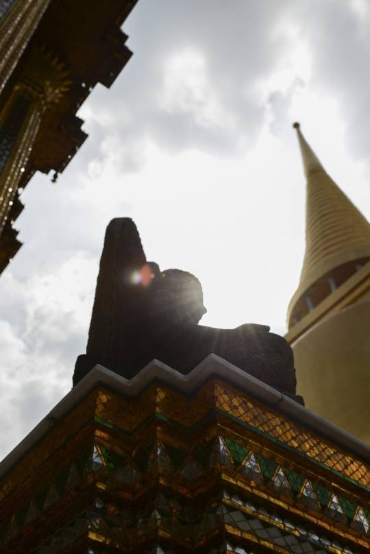 玉佛寺中有很多殿宇,金碧辉煌,其中玉佛殿、金塔等建筑比较著名。有趣的是小编在大王宫中发现关公雕像。拍摄大王宫,除了要注意构图,同时非常考较这款相机色彩表现力,同时天空阴云也能展现宽容度。