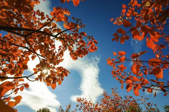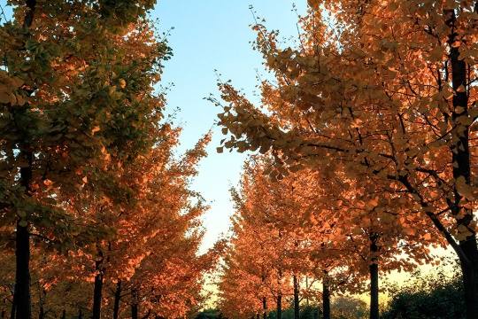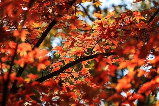 远处的树林、近处的树木和空中的枝叶,绿的皎洁、黄的闪光、红的夺目,构成了色彩斑斓的深秋美景。