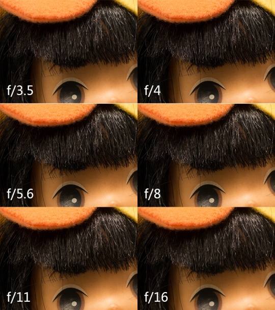 上图可以看出,在最大光圈F3.5的时候锐度就很不错,从F4后逐渐进入最佳状态,持续到F11时表现良好,F16开始有所下降。再往后锐度下降还是比较明显。