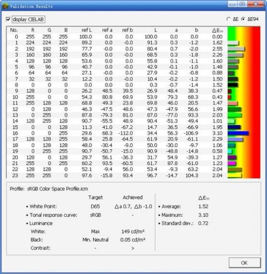 basICColor检测色差,平均值为ΔE1.52,最大色差ΔE3.10,此色差作为一般浏览、游戏、影视使用者没有任何问题,但作为专业图形图像颜色控制来说,色差有点大。