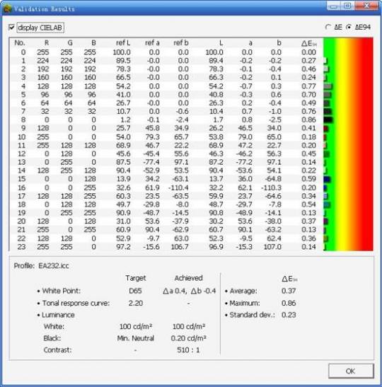 在严格的256级灰度表现上,最大色差也只有1.6,平均色差只有0.52。表现非常出众。之前EA191M在256级灰度检测时,最大色差为2.07,EA232WMi显示器要远远好于它。