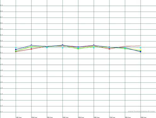 不同灰度的gamma值,校正前亮度越高,gamma值越低,在90%亮度时,平均gamma值只有1.8,而且蓝色还呈现很大的滑坡。而校正后,gamma值全部维持在2.2左右波动。