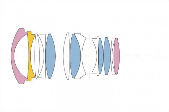 镜头采用含1片FLD镜片和4片SLD镜片的13片11组镜头结构。镜片经过超多层镀膜技术处理,能消除耀光及鬼影。配设 9片圆形光圈叶。