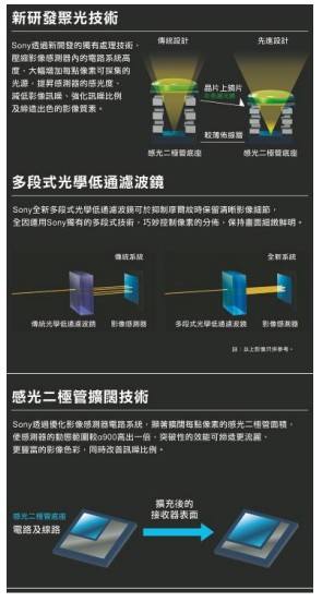 感光二极管扩充技术则是透过优化影像传感器电路系统,扩充每点像素的感光二极管面积,使传感器的动态范围较α900高出一倍,同时改善讯噪比例,进一步增强感亮度及减低讯噪。