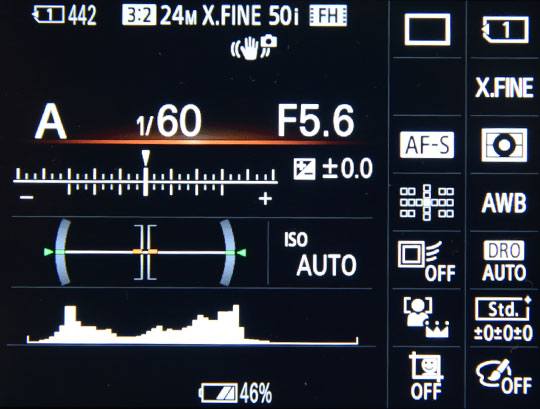 为了更舒适和直观的操作,索尼α99采用新研发的Quick Navi Pro界面(快速导航专业版),该界面从α700、α900的界面加以改良,加入柱状图及电子水平仪等参数,操控更为直接,无需进入主选单即可以快捷地以单手设定各项重要拍摄参数。