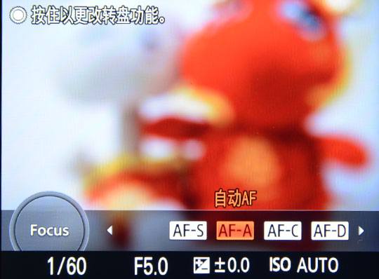 该按钮和转盘默认与α77一样是选择对焦模式,如果自定义其他功能,可以长按该按钮,取景器或显示屏出现,这样转动转盘可以进行选择。静态拍摄下可选:对焦模式/自动对焦区域/选择自动对焦区域/曝光补偿/测光模式/ISO;动态短片下可选:录音音量/对焦模式/自动对焦区域/选择自动对焦区域/曝 光补偿/测光模式/ISO/快门速度/光圈。不过该按钮无法在关机状态下设置,如果使用手动对焦,只能使用镜头上的切换开关,镜头不具备切换开关只能开机后调节。即便开机后。