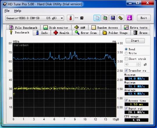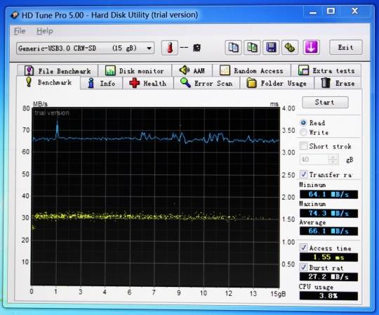 HD Tune Pro的测试结果来看,EXCERIA HD型 SDHC存储卡的读取速度达到了74.3MB/s的成绩相当不错。