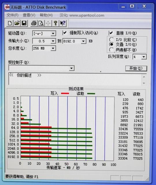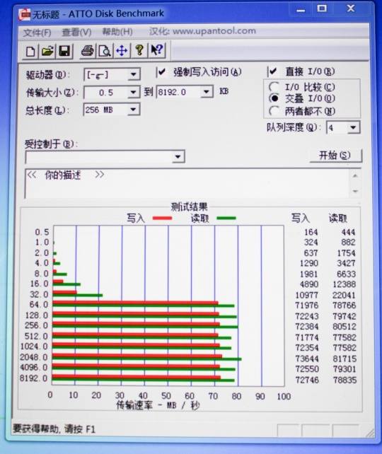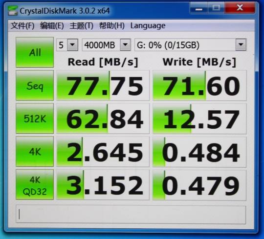 CrystalDiskMark是一款简单但非常易用的磁盘性能测试软件。界面很直观,测试项目一目了然。此软件的测试结果77.75MB/s读取速度和71.60MB/s的写入速度让人满意。