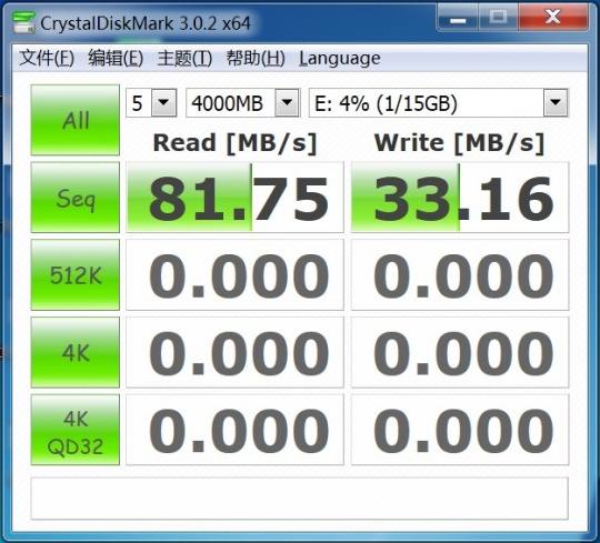 CrystalDiskMark软件测试结果成绩也不错,其中的写入速度依然超过30MB/s,达到33MB/s,在读取方面,更是突破了80MB/s,达到了82MB/s左右。