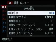 以下为拍摄菜单的显示画面。PowerShot G15的文字显示最大也最好识别,相反文字最小则为DSC-RX100。画面显示主要分为滚动条式和列表显示两种。而所有相机的拍摄菜单均设计有主页,但显示内容根据各厂商主旨不同而各有特色。