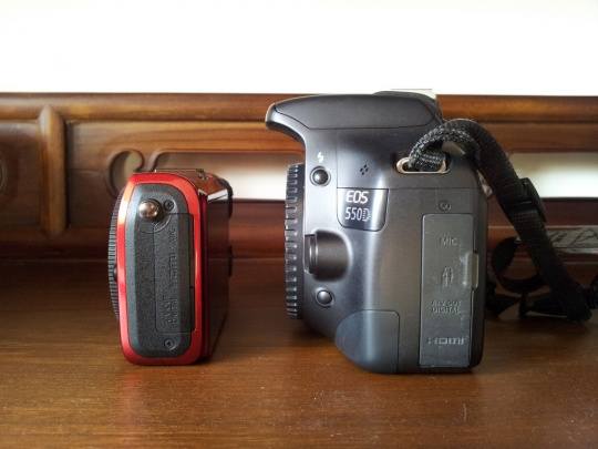 EOS-M和EOS550D的机身厚度相比,可见EOSM在机身体积上缩小了很多。