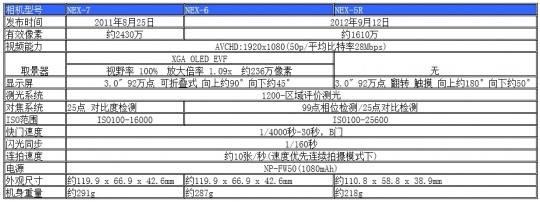 而NEX-7的像素较高,高ISO表现逊于NEX-5N,这样的情况让不少用户希望有一款次旗舰的微单产品,比“5”系列操控更好,比“7”系列像素更低且高感更好。想来索尼也听到这方面的诉求,于是今年不仅更新了“3”、“5”。同时推出了“5”、“7”混合产物——NEX-6。下面我们不妨看看NEX-6与NEX-5R、NEX-7规格比较:
