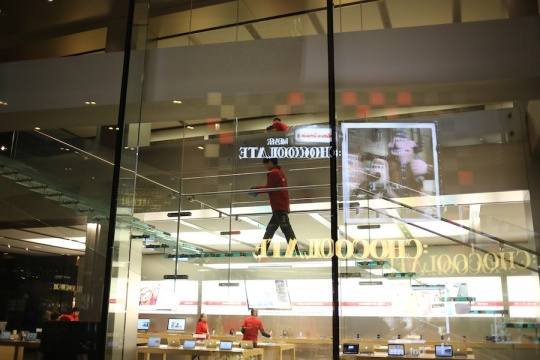 已经清场的苹果三里屯店,抓拍一张,分别为一楼、正在上楼和二楼的工作人员