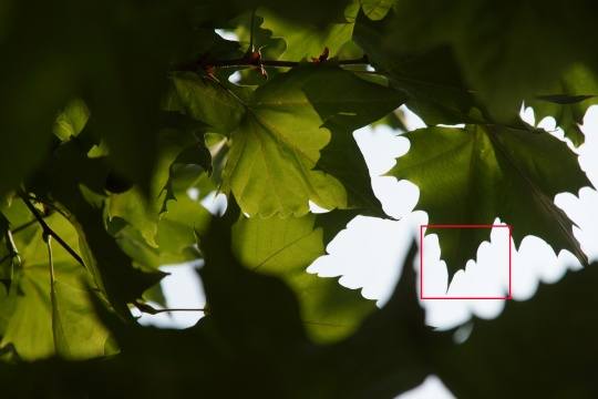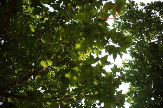 大光比逆光下,我们观察一下叶片交接部分。从图中可以看到这款镜头全开光圈存在紫边,收缩光圈紫边有一定减轻(F8之后基本消失)。