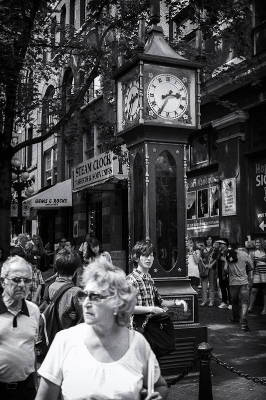 温哥华非常著名的蒸汽钟,这座蒸汽钟主要是利用地底的蒸汽来带动时钟发条的,每十五分钟蒸汽会从地底冒出。喷出蒸汽的钟盖会发出呼呼的汽笛响声,非常有趣。不过蒸汽钟年纪大了,时间就不准了,但呼呼的汽笛声和冒着白烟的蒸汽,仍是游客争睹的奇景。
