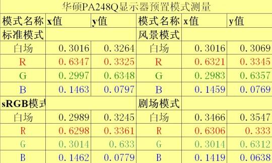 先看图半个小时。接上色度计,开始对预设的四个状态进行测量。这里不再分别录入数据,具体四个预设状态下的白场色温和RGB三基色坐标值看电子表格截图。