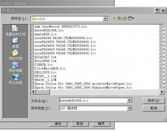 在AdobeGAMMA这个小程序里要调整显示器之前都会要大家给自己显示器预先加载一个ICC文件。于是很多人都毫不犹豫地给自己的显示器加载了著名的AdobeRGB1998.而这个小程序在这里似乎没注意给大伙儿留下了一个陷阱——只要你点击“确定”后,总会弹出一个另存为的窗口要你保存这个ICC文件,通常这个概念都很模糊,多数人可能也就想当然地直接点击保存了事。