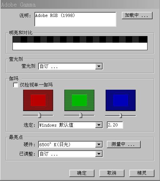 对于不打算采用仪器进行测量的人,AdobeGAMMA小程序是一个廉价而试用的小工具,不论老编校色或者其他职业选手,包括本人在内也都用这个小工具为自己的显示器得到过正确的颜色,所以大家不必怀疑它的实用性。