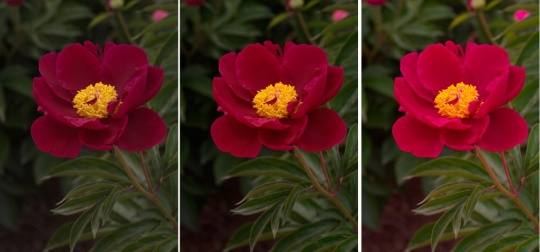 左边这张是以sRGB定义的原图,中间这张是原图在不做任何转换时在符合AdobeRGB标准的显示器上显示的结果。而最右边这张是原图不做任何转换直接在一台广色域高亮显示器上显示的结果,当然原图的数据没有改变,但是同样色值在不同显示器上最终的色感被改变了。