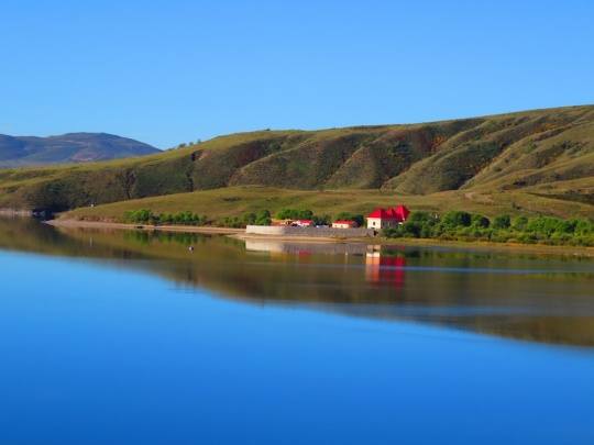 在晴朗的草原地区,有水的地方总带着点灵气,山上的羊儿慢慢的吃草,悠哉的很。