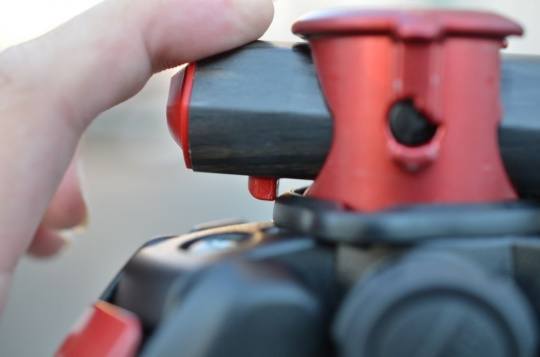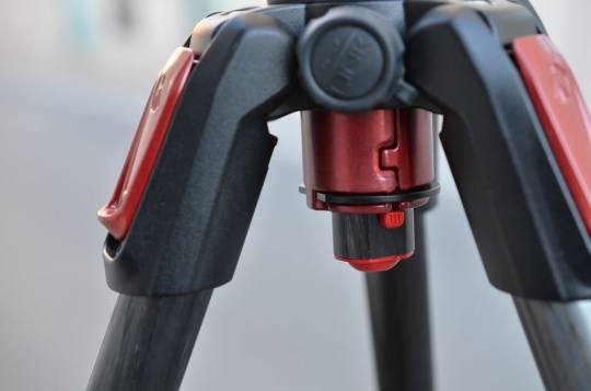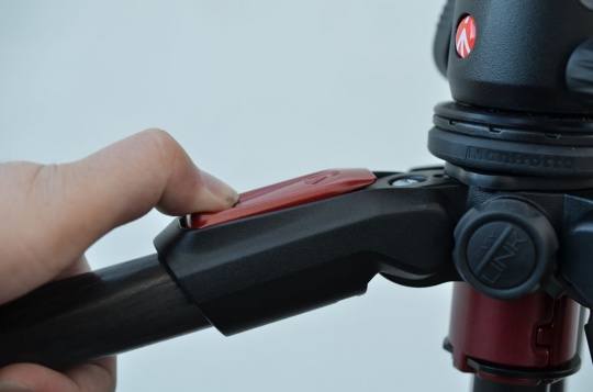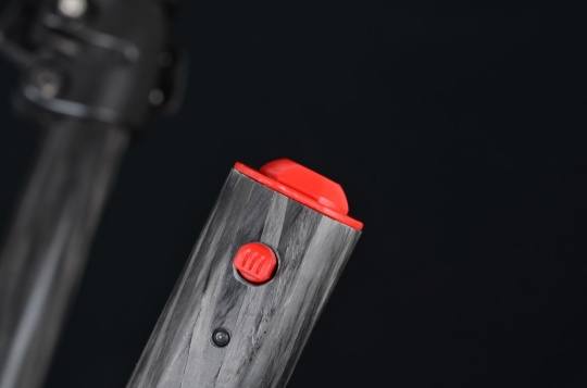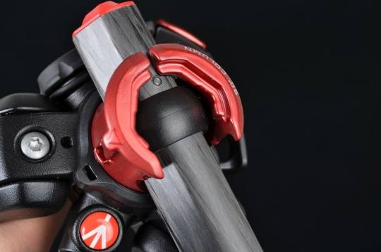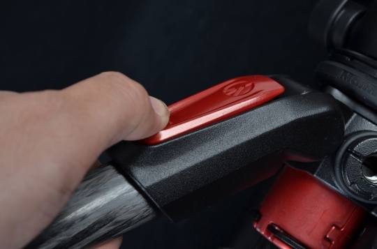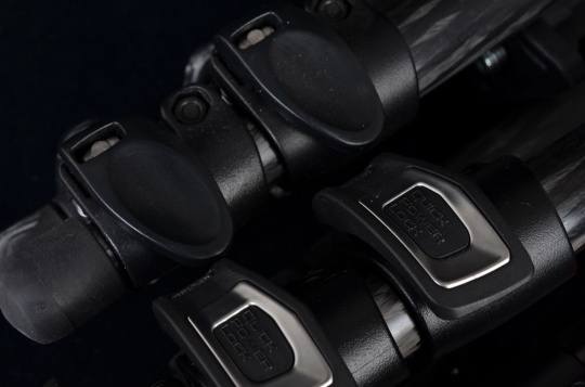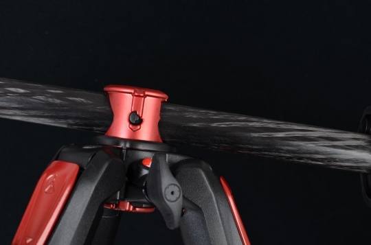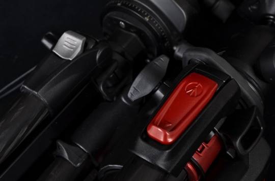 这款脚架采用四节设计,脚架脚管采用100%碳纤维制造,保证支管的刚性并可吸收震动。这款脚架采用新型的脚管角度选择器,按钮更大,且采用红色,更为直观靓丽,按下该按钮能将脚管打开,打开角度为25°,46°,66°,88°