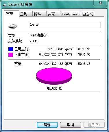 从容量上看,这张64G的600x存储卡的实际容量为59.6G,损失了4G多的容量,这个在大容量存储卡中是比较正常的。