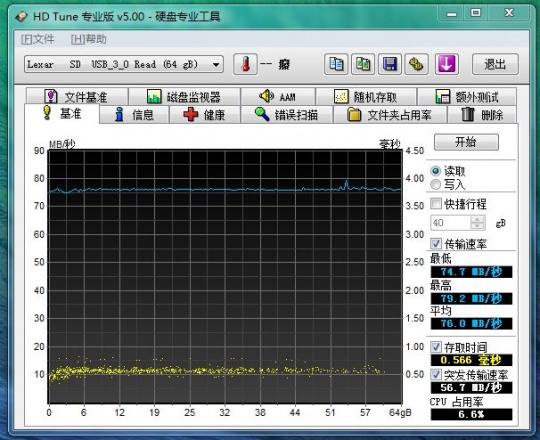 测试完毕该软件给出的平均读取速率为76MB/S,这个读取速度对于存储卡来说已经非常高了,在拍摄完视频进行回放的时候不会出现卡顿的现象。另外,从黑色的波纹直观图中可以看出这款Lexar 雷克沙读卡器的稳定性也非常好,一直保持的比较稳定。