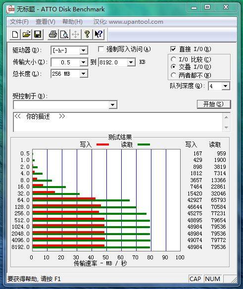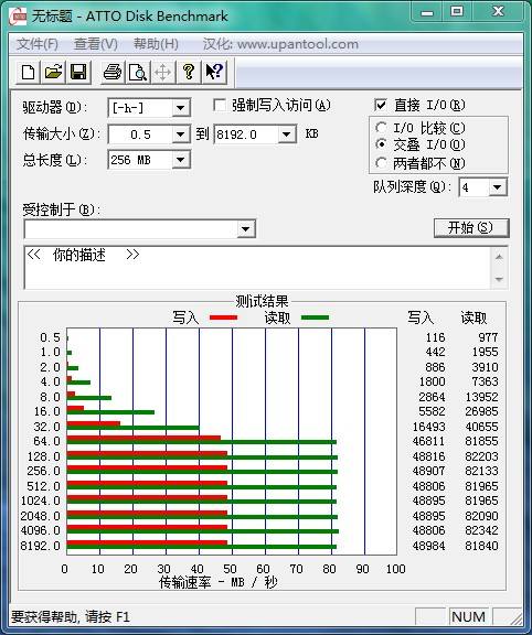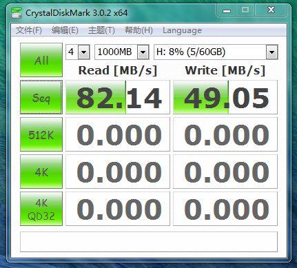 接下来的是ATTO Disk Benchmark的测试结果:成绩与CrystalDiskMark3.0.2接近,写入接近50MB/S,读取继续达到82MB/S的高水准。