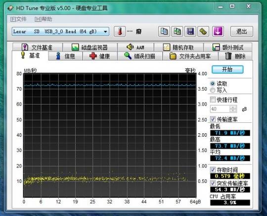 HD Tune是一款测试存储卡读取速度的专业软件,通过反复的读取测试展示存储卡的平均传输速率。