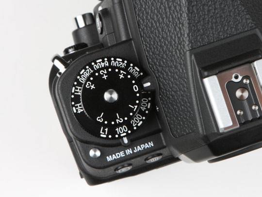 首先,最引人关注的是Df的外观设计。其以尼康FM/FE系列胶片相机的外形为基调,机身线条十分硬朗,配备棱角分明的五棱镜,机身顶部布满精密的机械转盘。右肩上除了快门模式转盘外,还配备了快门顶针等各项机械转盘,而左肩上则设置有ISO感光度转盘和曝光补偿转盘。其中,快门模式转盘是 使用老式纯手动单反上的刻度进行标注的,极具怀旧感。这些转盘均采用金属制造,并进行了精巧的压 花处理,拥有高品质质感。