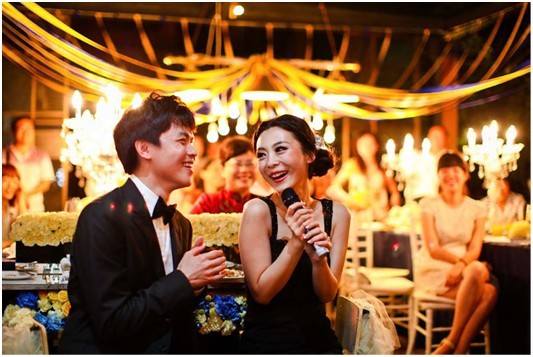 如果不仅仅局限于观察人,就能发现婚礼中的很多细节都是值得回味的,哪怕是司仪使用的麦克。虽然此时孤零零地伫立在那里,却好像也趁着身后喜庆的红色来表达着自己的欢欣鼓舞。镜头所制造的强烈空间感极大程度地渲染了这一别样的画面。
