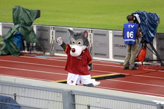 罗马队的吉祥物绕场向球迷致意。欧洲的足球赛,像一场盛大的Party,一场狂欢节,每个人都很开心,每个环节都会想办法让你开心。