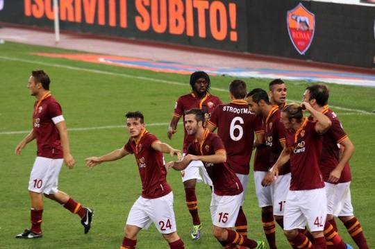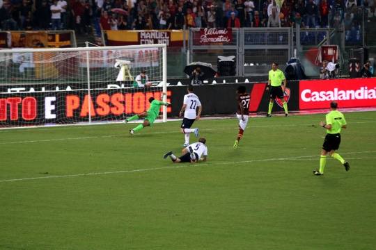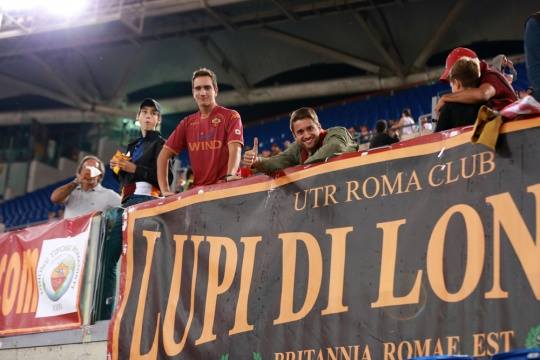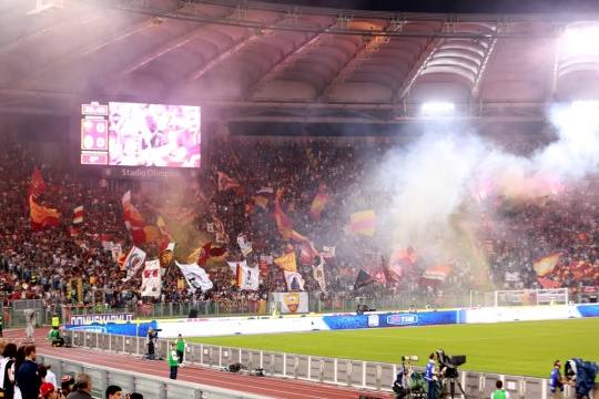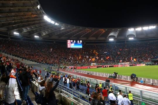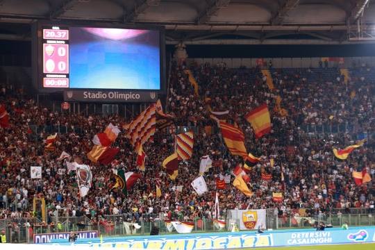 比赛结束,罗马5:0胜博洛尼亚,开心的球迷久久不愿散去。