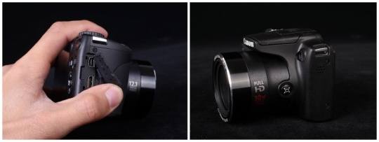 相机的两侧分别设置了数据传输接口和一个辅助构图的按钮。SX510HS配备了HDMI接口,可以方便用户传输拍摄好的高清视频。可谓麻雀虽小,五脏俱全。