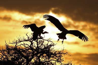 弱光条件下依然测光精确夕阳西下,在树冠上发现了两只秃鹫。因为现场光比较大,故采用评价测光模式进行拍摄,很幸运地捕捉到了其中一只展翅欲飞的瞬间。