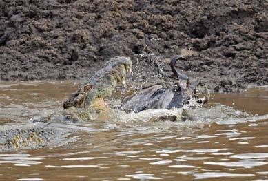 正当所有人正聚焦于这场狮王争霸赛时,突然有人一声惊叫,原来河这边的“角马强渡战”也已拉开帷幕。一条巨大的鳄鱼正全速游向河对岸受伤的角马,我火速端起EF 500mm F4L IS Ⅱ USM。果断完成构图后,接下来就交给EOS-1DX的12张/秒高速连拍了。鳄鱼在靠近角马半米的距离发起攻击,并迅速将其拖入水中,角马很快就没了气息,整个猎杀也就持续了几十秒。得益于EOS-1DX强劲的自动对焦和高速连拍,我清晰地拍下了整个过程,并从近百张照片中挑到了一张水花四溅且眼神颇有内容的作品。