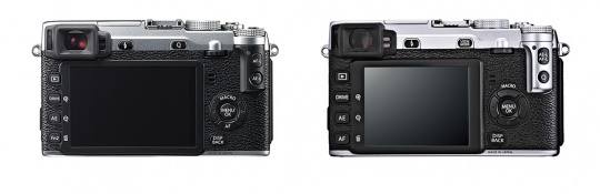 在机身背面的设计中,X-E2与X-E1略有不同,其中,Q键被单独放置在了液晶屏的右上方,下图为对比图:
