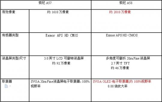 从性能上来说,A58最大的改进是采用了全新的ExmorTM APS HD CMOS影像传感器。让所有的索尼单电相机产品都来到了2000万级别像素水平。让入门用户也能享受到高像素带来的清晰影像和后期裁剪优势。下面通过一个图表来对比一些A57和A58的一些不同。
