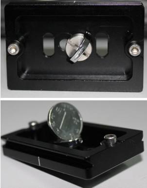 快装板底部提供2枚防滑落销子,底座对应2个凹槽,防止相机竖拍时,快装板因重力作用向两端滑出锁紧夹具,保护十分周到。