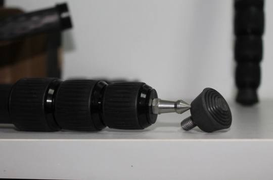 三脚架底部,为橡胶小鞋一枚,橡胶材质厚实富有弹性,其与脚架的链接螺丝涂满防锈油脂,秉承科曼公司注意细节的一贯传统,再次印证这个脚架细节完美的主要特征。该胶垫必要时可更换为P7中的金属尖头地钉,以极大的增强脚架在软性地表的稳定性。