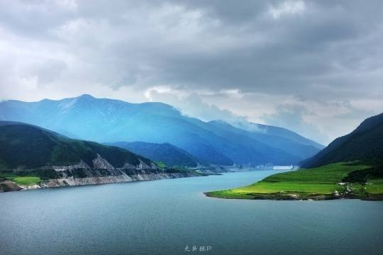 水库背面的山谷,却已经是蓝天白云,阳光灿烂。