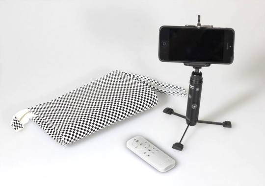 首先来看看这套产品,包括一个储物用的手包,一个蓝牙遥控器以及一个便携式的微型固定支架。
