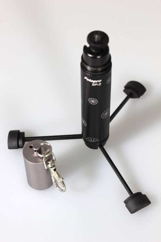 套装的另外一件重要配件,就是这个便携式的微型脚架,平常不需要使用的时候下方的脚垫可以藏起来,另外上方还带了一个钥匙扣,挂在其他的包包上也没有问题。