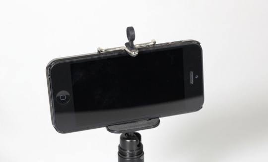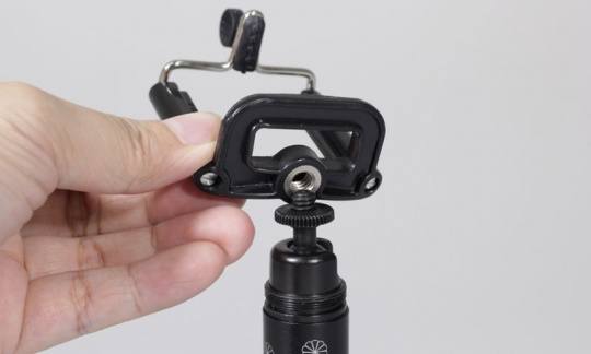 云台再接入附送的手机夹,整个脚架的组合就完成了,相当简便。手机夹能够上下调整高度,便于固定不同型号的手机。